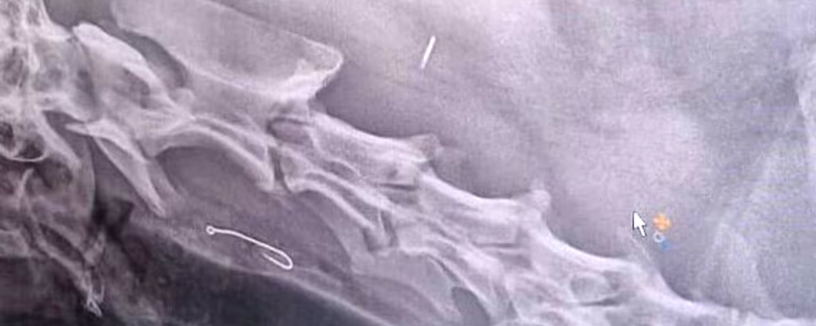 "Het was een hele lange lijn, met lood en haken en stukjes vis eraan", vertelt Valster aan RTL Nieuws. "Ik ben nog nooit zoiets tegengekomen op het strand." De restjes vis aan het dunne lijntje verdwijnen binnen een paar seconden, met lijn en al, in de bek van Django. Valster belt de dierenarts en kan meteen terecht in Goes. Op de röntgenfoto blijkt de haak vast te zitten in zijn slokdarm. Twee uur lang probeert de dierenarts het eruit te krijgen met een tang, maar zonder resultaat.