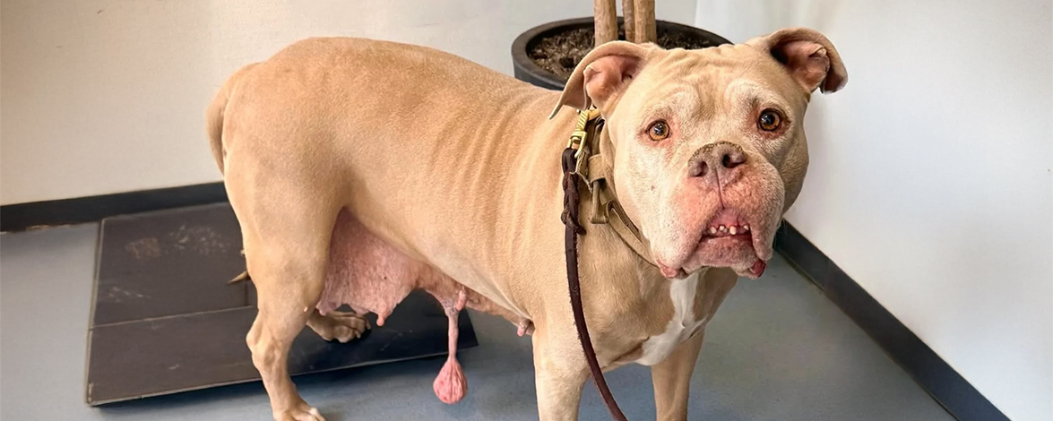 De medewerkers schrokken direct toen ze de hond zagen. "We wisten meteen: dit is foute boel", schrijven ze op Instagram. Er werd een afspraak gemaakt bij de dierenarts voor een operatie, maar de eigenaar kwam niet opdagen.